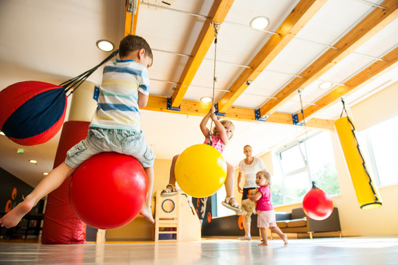 Mit der Rutsche geht es von der Lobby direkt in die Kinder-Erlebniswelt, den Fit & Fun Club, empfohlen für die Altersgruppe von 3 bis 10 Jahren. In diesem Bewegungsraum wird selbstständig geturnt und getobt.
